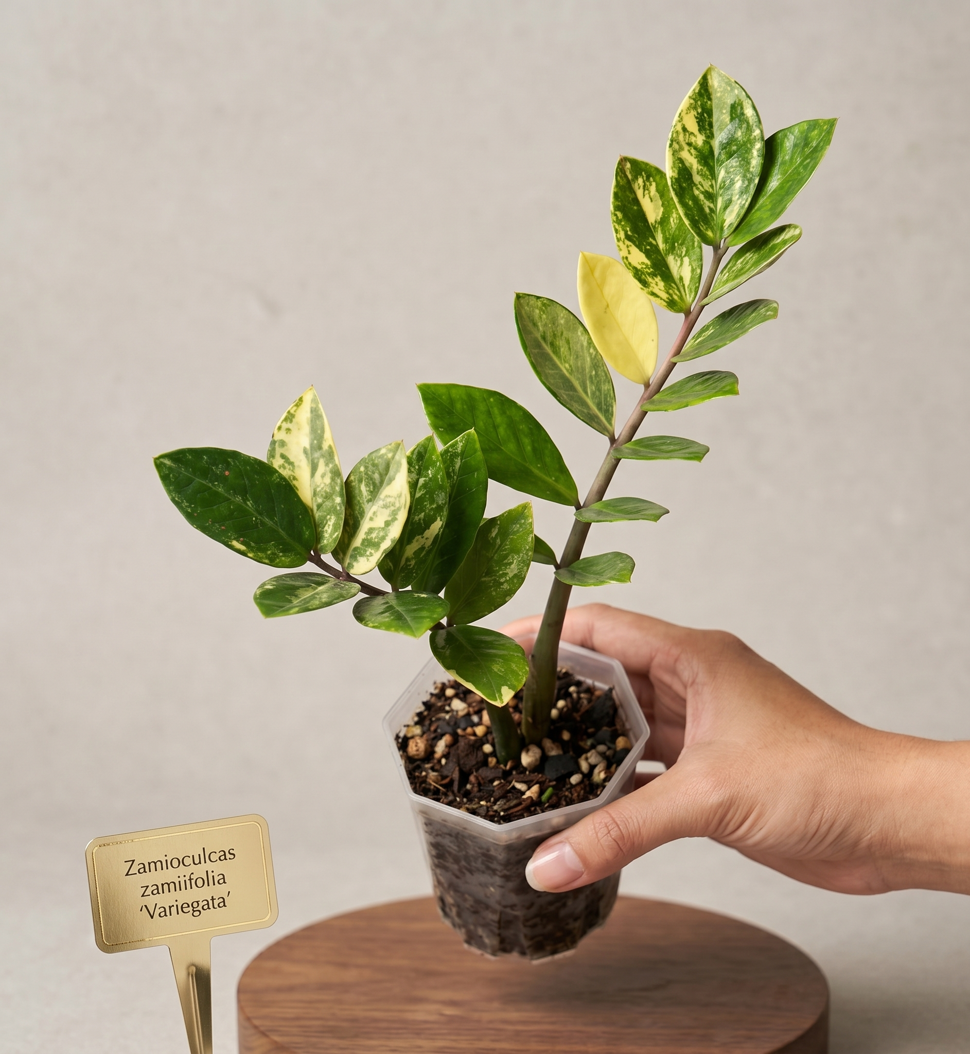Si la Zamioculca tradicional es la “planta de acero”, la Zamioculca Variegada es la joya de la corona. Esta variante extremadamente rara y codiciada presenta espectaculares patrones de color crema y amarillo sobre sus características hojas verdes brillantes, convirtiendo cada ejemplar en una obra de arte natural única.